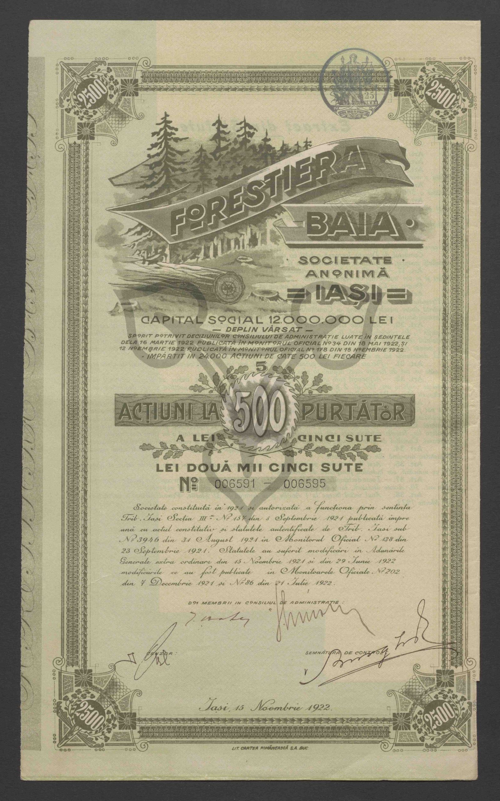 Gesellschaftskapital 12.000.000 Lei Voll eingezahlt. 5 Aktien zu 500 Lei Fünfhundert Lei. Zweitausendfünfhundert Lei. Nr. 0006591 – 006595