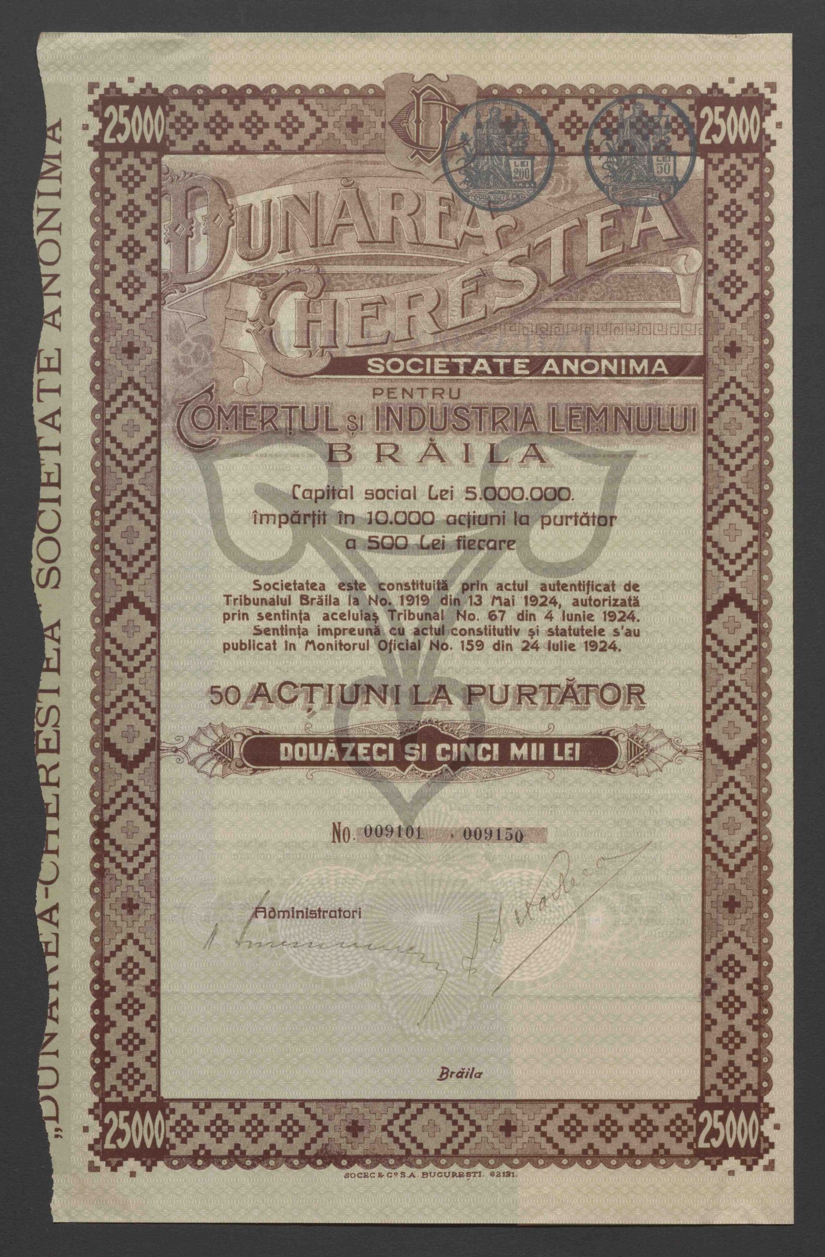 Gesellschaftskapital 5.000.000 Lei, aufgeteilt in 10.000 Inhaberaktien zu je 500 Lei. 50 Inhaberaktien 25.000 Lei. Nr. 009101 – 009150