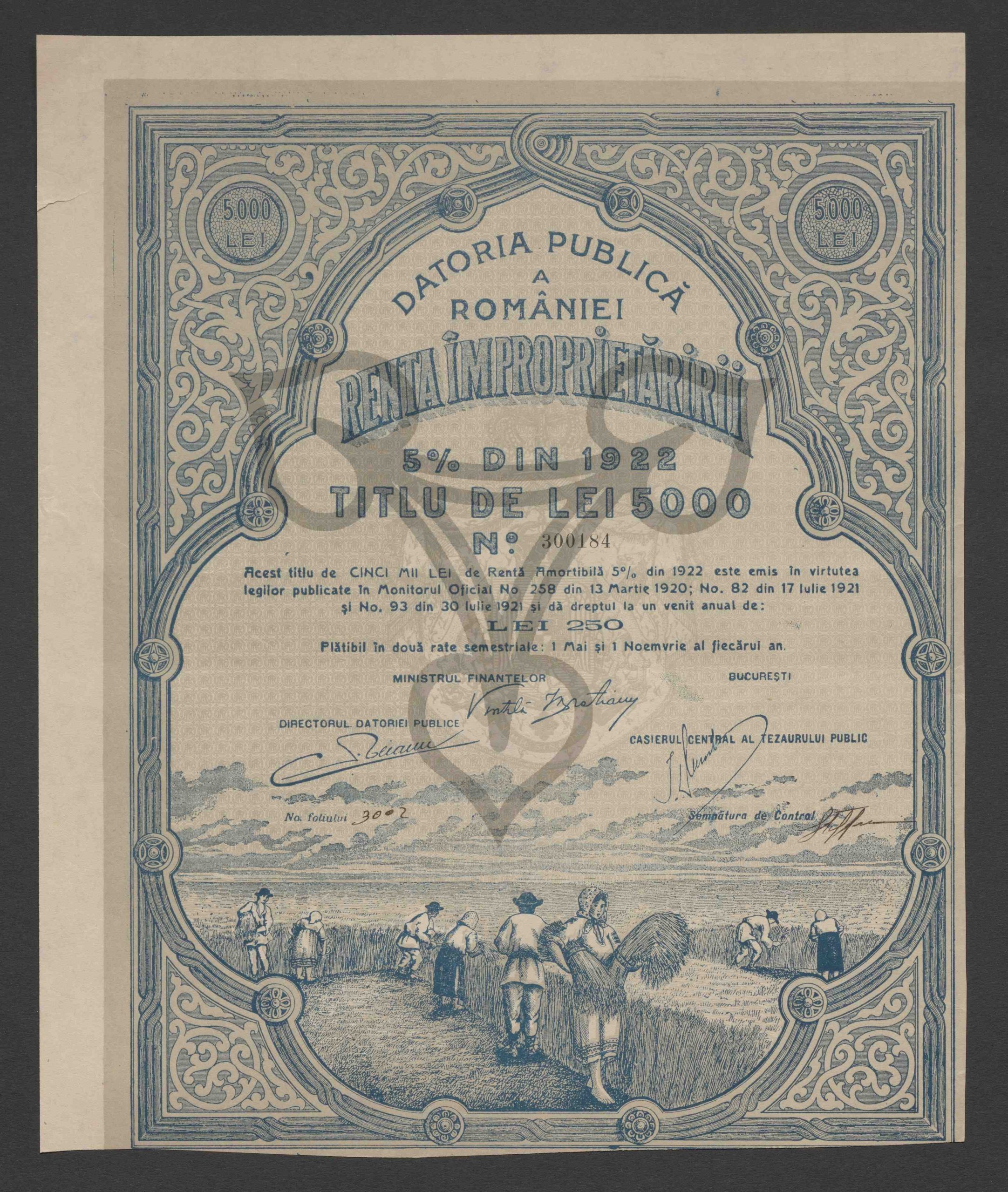 Originaltitel: Renta Împroprietăririi 5 % din 1922, Titlu de Lei 5000 No. 300184