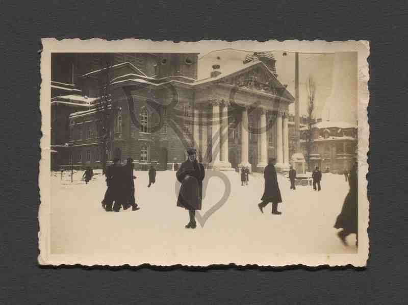 Hilda Sando steht, bekleidet mit einem dunklen Winterpelz und Hut, vor der verschneiten großen Freifläche vor einem neoklassizistischen Gebäude und blickt in die Kamera. Zwischen ihr und dem Gebäude gehen, teils grüppchenweisen, weitere Personen herum.