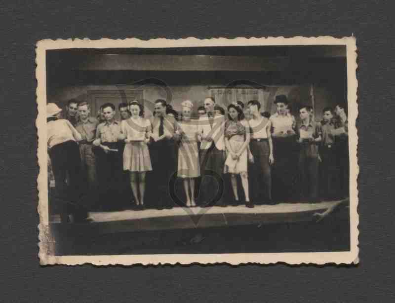 Hilda Sando in hellem Kleid mittig auf einer Bühne unter ihren Schauspielerkollegen.