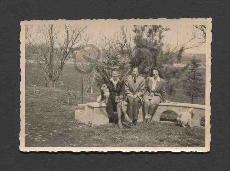 Die Gruppe aus zwei Frauen, einem Mann und zwei Hunden sitzen im Freien auf einer steinernen Bank. Im Hintergrund vereinzelt Bäume, Gebäude, ansonsten offenes Feld.