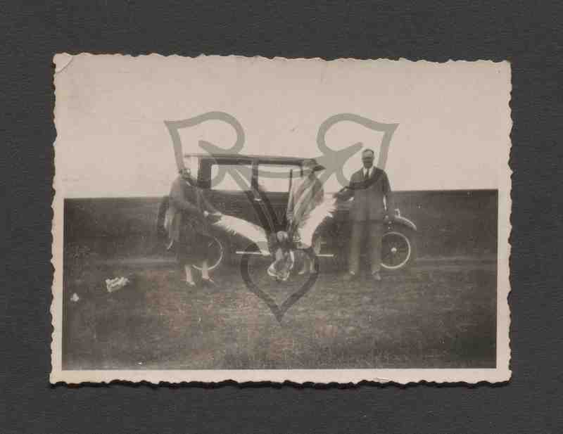Hilda Sando steht auf offener Wiese in Begleitung einer Frau und eines Mannes vor einem Auto. Sie und der Mann halten die aufgeschlagenen Flügel eines Greifvogels in den Händen.