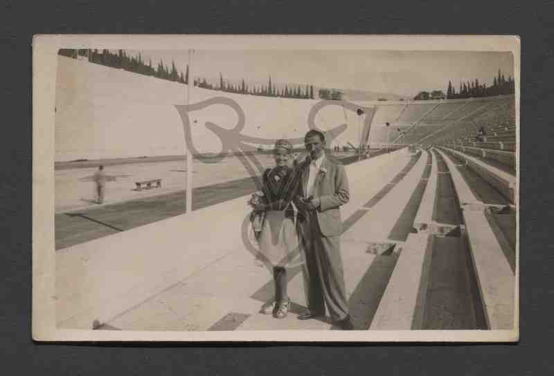 Die beiden Personen stehen der Kamera zugewandt auf den unteren Rängen eines Stadions (Berliner Olympia-Stadion?). Die Frau ist mit einer dunklen Bluse und einem hellen Rock bekleidet, der Mann rechts neben ihr in einem grauen Anzug mit weißem Hemd. Im Kragenknopfloch trägt er eine Blume.