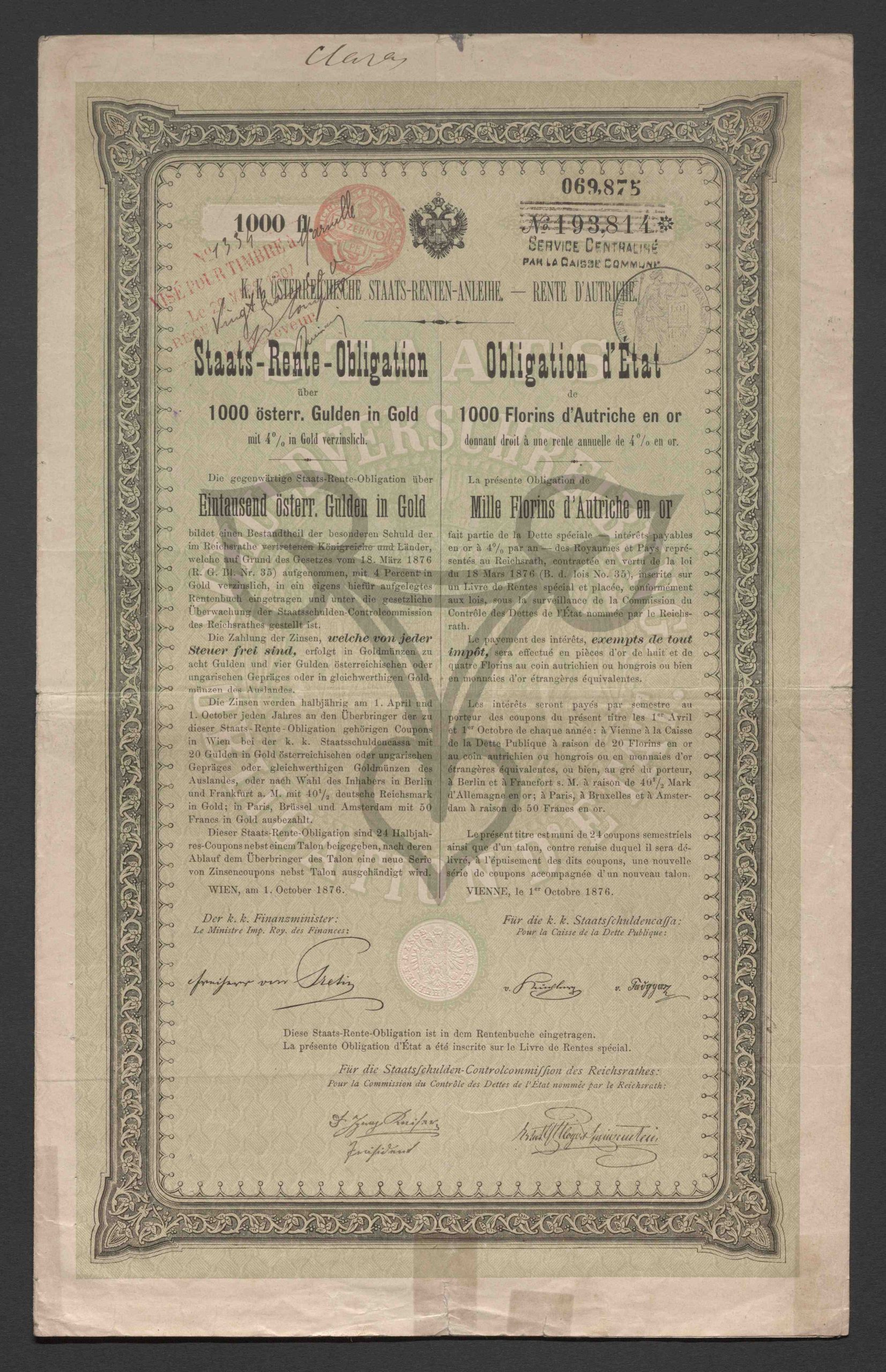 Originaltitel: Rente d'Autriche. Obligation d'État de 1000 Florins d'Autriche en or donnant droit à une rente annuelle de 4 % en or, No. 193.814
