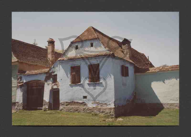 Abgelichtet ist die Straßenfront des verfallenden, blau angestrichenen Hauses, Giebelfront mit Eingangstür und links davon Tor mit gemauertem Torbogen.