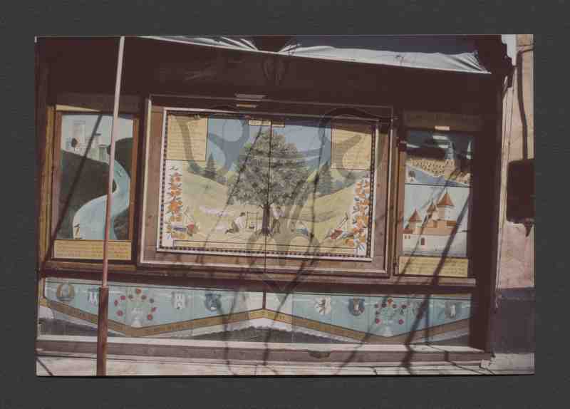 Zu sehen ist die Holzkonstruktion eines Triptychons mit gemalten Schaubildern die im Innenhof eines Gebäudes an der Außenwand angebracht ist.