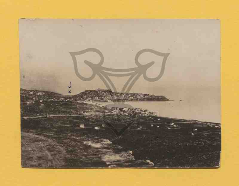 Blick von Land auf Hafen und vorgelagerte Insel Thasos.