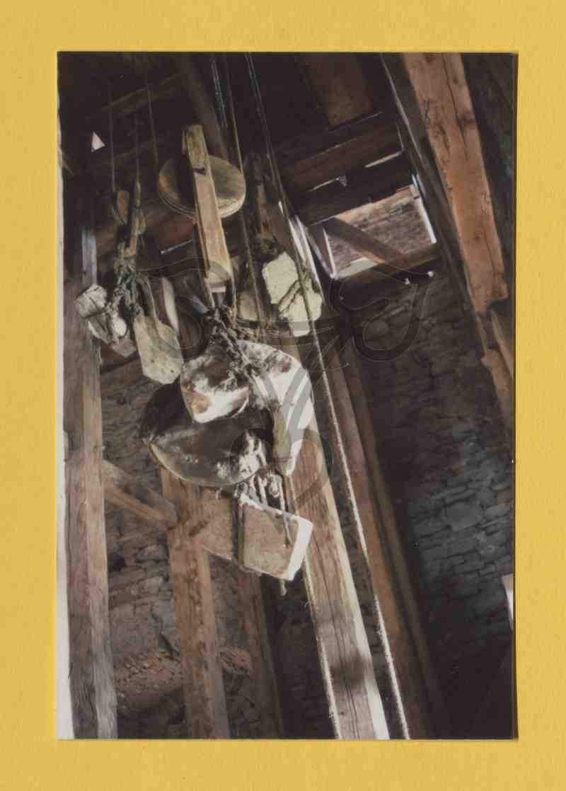 Hölzerne mehrgeschossige Innenkonstruktion des Turmes mit von der Decke hängenden Seilzügen mit Gewichten. Blick von unten nach oben.