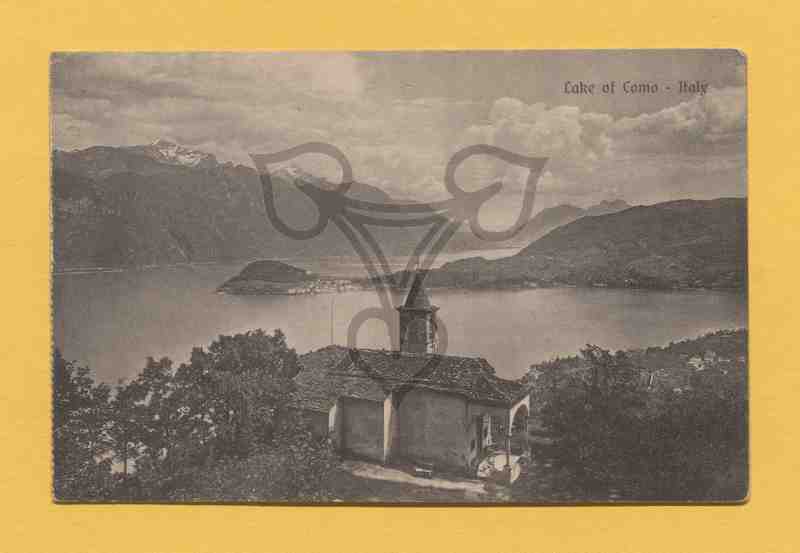 Blick auf den Comer See. Bildmittig am unteren Bildrand eine Kapelle, dahinter eine weit in den See hineinragende Halbinsel mit markantem Hügel an deren Ende. Am Fuße des Hügels eine Siedlung. Im Hintergrund Bergketten, darüber bewölkter Himmel.