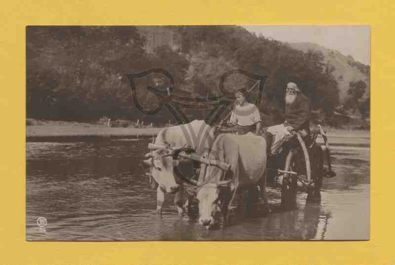 Ein von zwei Kühen gezogener Leiterwagen steht in einem Fluß, die rechte Kuh säuft, die linke blickt die rechte an. Auf dem Wagen eine junge Frau mit einer Peitsche in der Hand, rechts hinter ihr ein alter Mann. Beide tragen rumänischen Alltagstracht. Hinter dem Ufer bewaldete Hügelhänge.