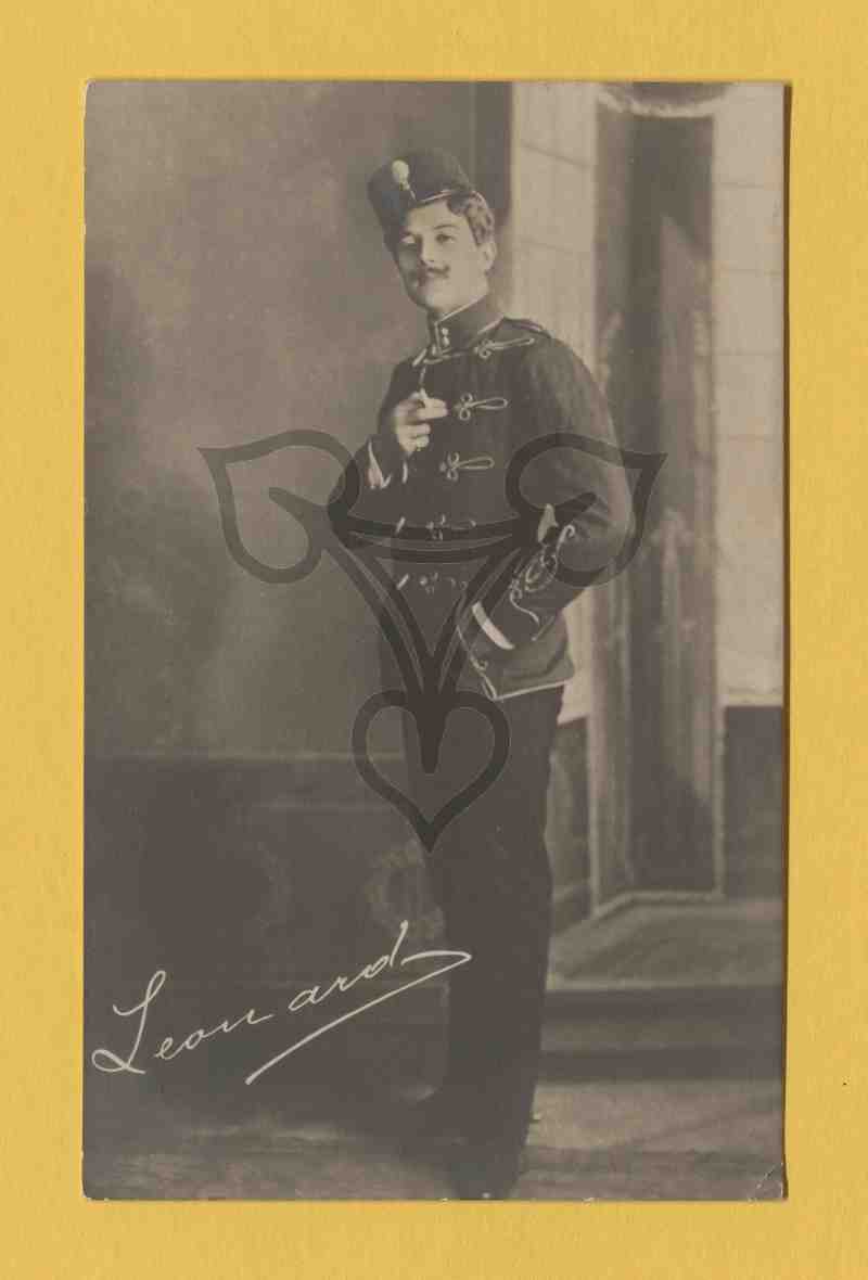 Studioaufnahme, gemalter Hintergrund. Der Schauspieler steht in einem Bühnenkostüm nach links gewandt aufrecht da und blickt in die Kamera.
