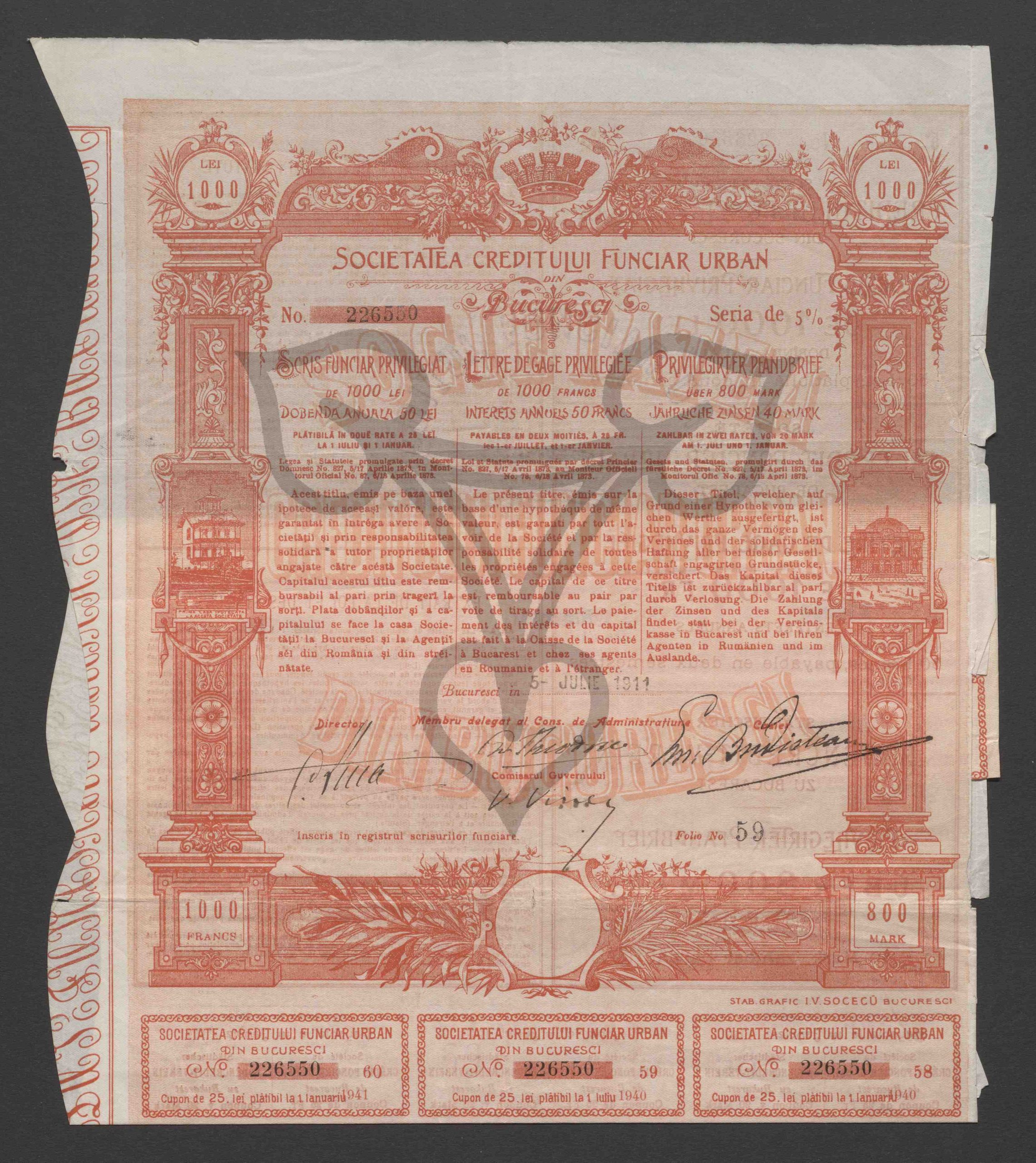 Lettre de Gage Privilegiee de 1000 Lei, Seria de 5 %. No. 59