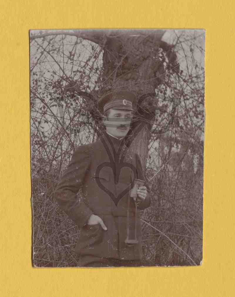 Mann in rumänischer Uniform (Modell 1912), steht aufrecht da, nach rechts gewandt und blickt rechts an der Kamera vorbei. Auf dem Kopf trägt er eine Schildmütze. Hinter ihm ein großer Baum, daneben Gestrüpp.