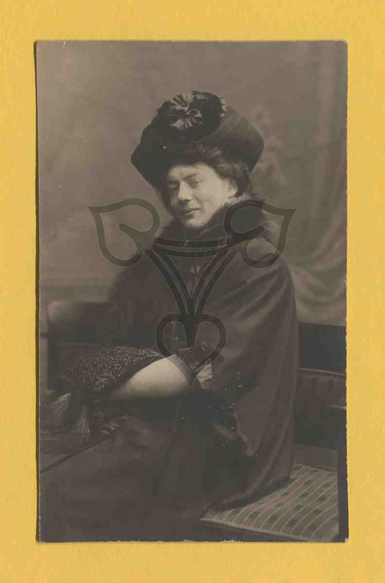 Studioaufnahme, gemalter Hintergrund, Sitzbank Requisit. Die Frau sitzt nach links gewandt auf der Bank und blickt in die Kamera. Sie trägt Rock, Mantel, Fellstola, Muff und Hut, alles in schwarz.