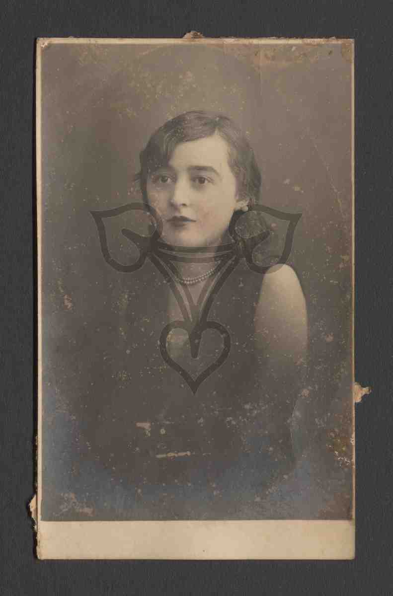 Studioaufnahme, neutraler Hintergrund. Die Frau sitzt nach links gewandt auf der Bank und blickt links an der Kamera. Sie trägt ein schwarzes Kleid, eine Perlenkette und Perlenohrringe.
