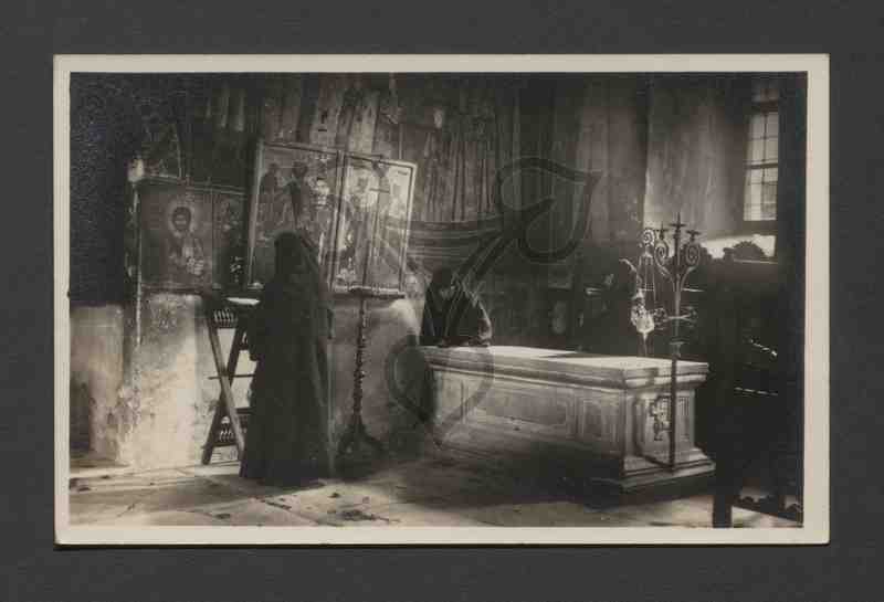 Zu sehen ist ein schwach durch ein Fenster erhellter Innenraum des Klosters, in dem ein Sarkophag steht. An der Wand Altarbilder, drei Nonnen beten.
