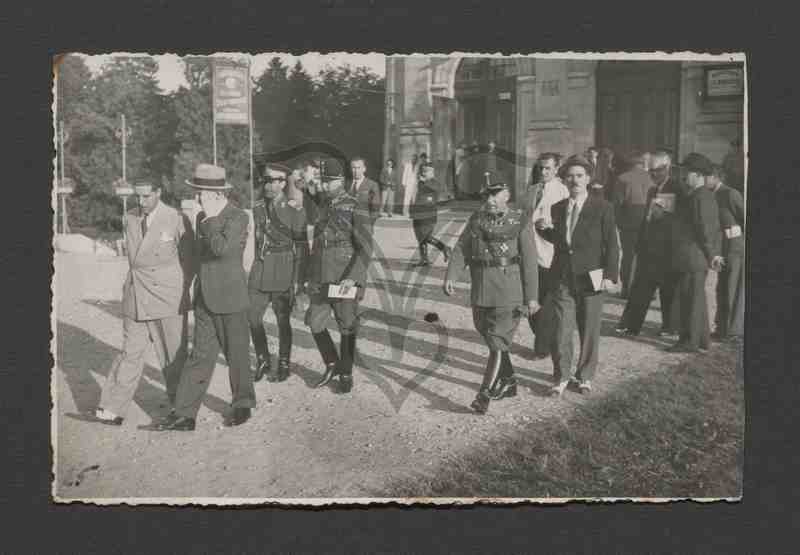 Auf dem Weg zu einem Gebäude ist eine größere Gruppe Zivilisten und Militärangehöriger in rumänischer Uniform (Modell 1912) zu sehen, die teils gruppenweise vor dem Eingang stehen, teils von diesem weck gehen. Im Hintergrund eine Baumreihe, davor eine erhöhte Hinweistafel, Laternen.