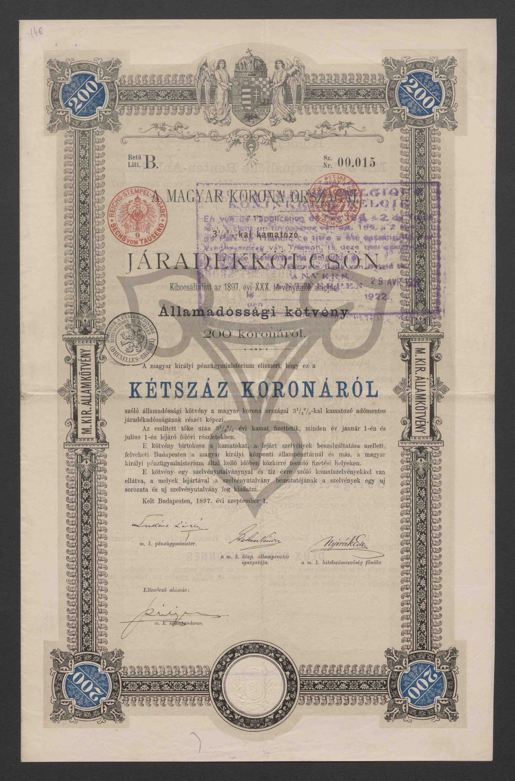 Originaltitel: 3 1/2 %-kal kamatozó Járadékkölcsön. Államadóssági kötvény 200 koronáról, Kétszáz Koronáról, Betű B, Sz. 00.015