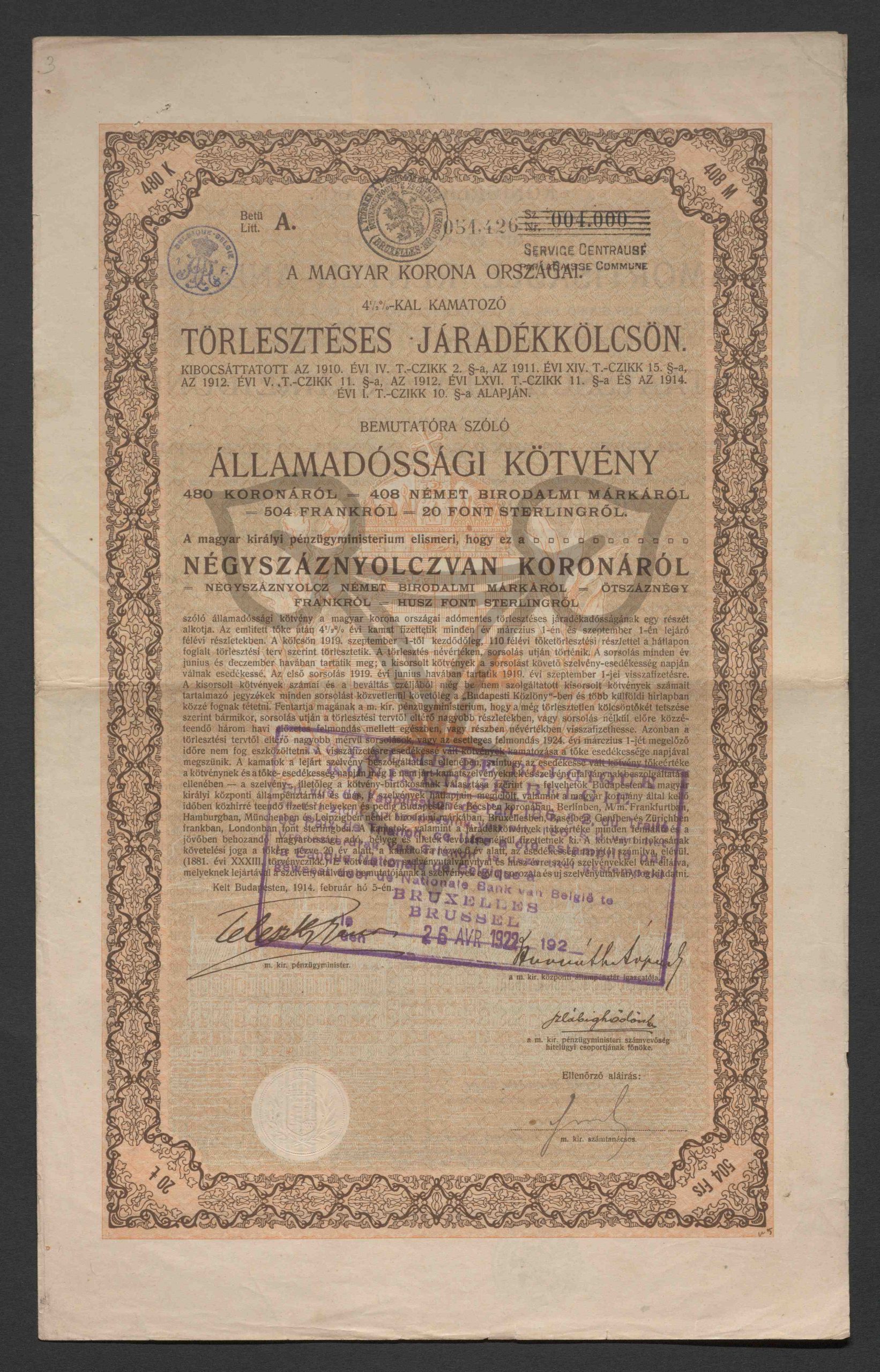 Mit 4 1/2 % verzinsliche Amortisable Rentenanleihe. Ausgegeben auf Grund des § 2 des Gesetzartikels IV vom Jahre 1910, des § 11 des Gesetzartikels XIV vom Jahre 1911, des § 11 des Gesetzartikels V vom Jahre 1912, des § 11 des Gesetzartikels LXVI vom Jahre 1912 und des § 10 des Gesetzartikels 1 vom Jahre 1914. Staatsschuldverschreibung auf den Inhaber über 480 Kronen, Litt. A, Nr. 004.000