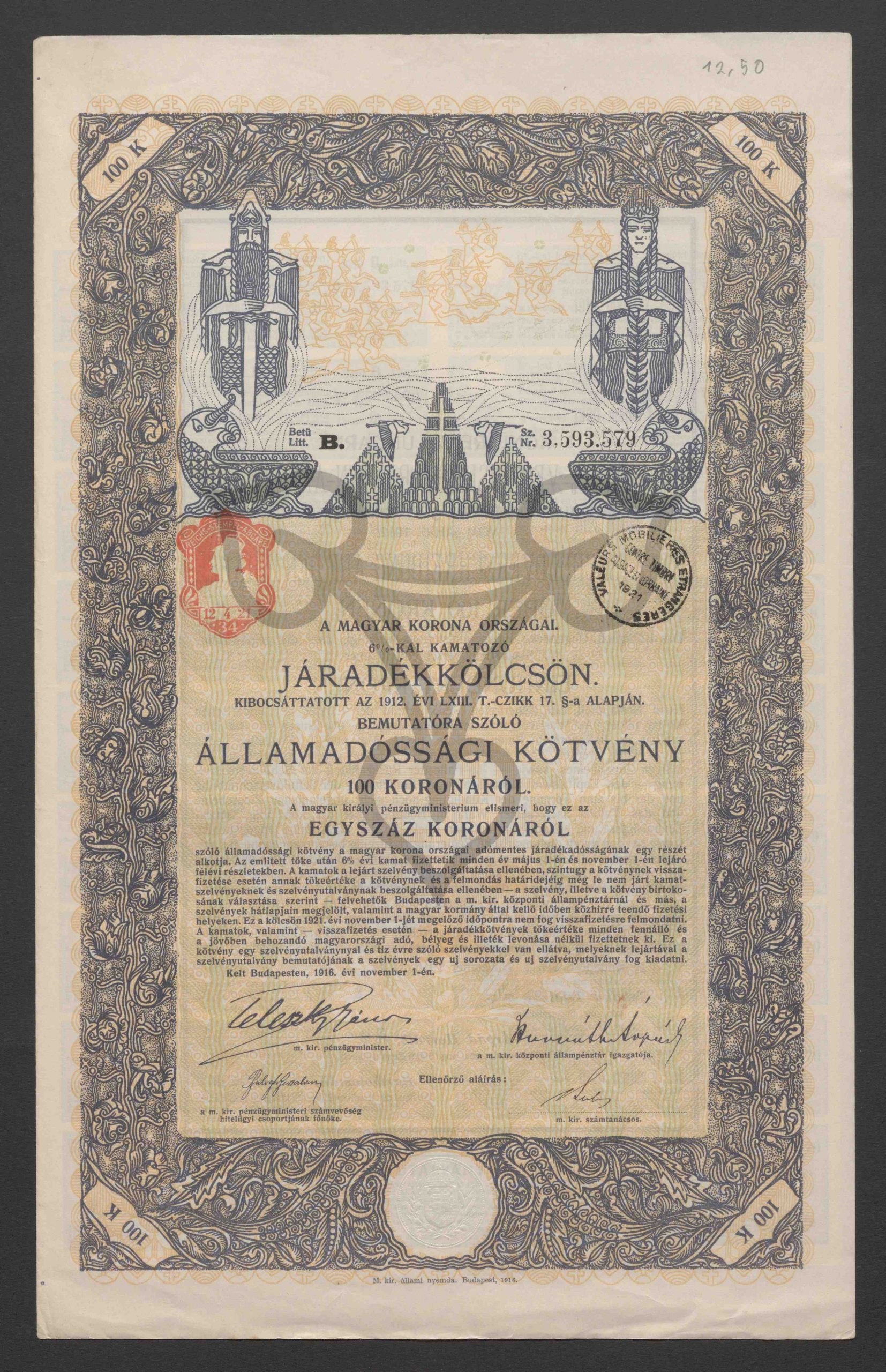 Originaltitel: 6 %-kal kamatozó Járadékkölcsön. Államadóssági kötvény 100 koronáról, Egyszáz koronáról, Betű B, Sz. 3.593.579