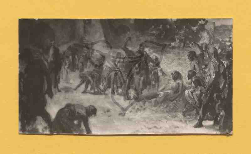 Fotografie eines Gemäldes, Detail. Ein nur mit einem Lendenschurz bekleideter Mann liegt am Bode, weitere stehen oder kriechen um ihn herum, teilweise wild gestikulierend. Im Hintergrund sind Mauern erkennbar.