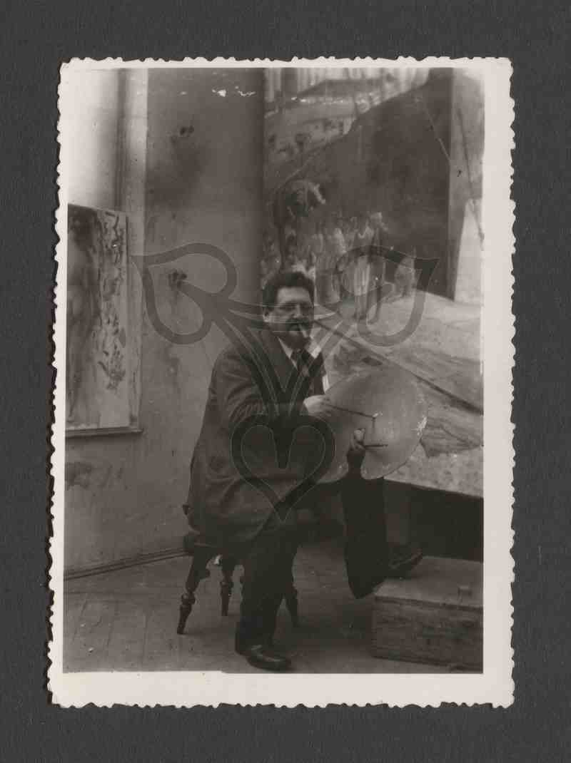 Der dunkel bekleidete Künstler sitzt in seinem Atelier auf einem Stuhl oder Hocker mit gedrechselten Beinen, ist nach rechts gewandt und blickt in die Kamera. In der linken Hand hält er eine Farbmischpalette, in der rechten einen Pinsel, dessen Borsten er auf die Palette drückt. An der Wand vor ihm hängt ein großes Gemälde, auf dem Fensterbrett hinter ihm steht ein kleineres.