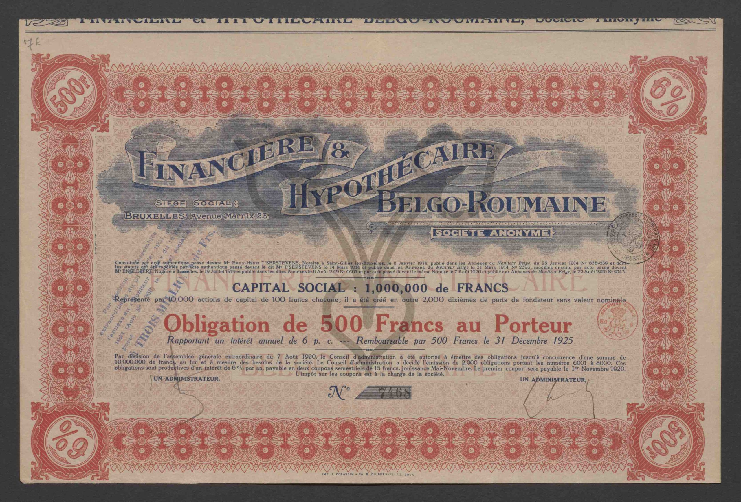 Obligation de 500 Francs au Porteur, 6%. No 7468