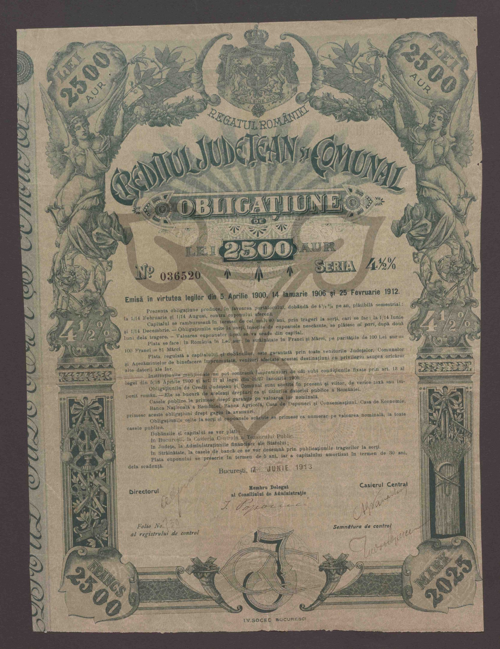 Originaltitel: Obligaţiune de Credit Judeţean şi Comunal. No. 036.520 de Seria 4 1/2 %, Lei 2500 Aur