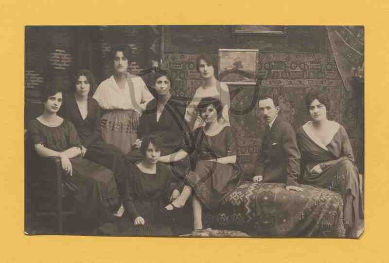 In einem an Wänden und auf Fußboden mit Teppichen ausgelegten Raum sitzen bzw. stehen mehrere Frauen und, bildmittig rechts, ein Mann. Alle blicken sie in die Kamera. In der rechten unteren Ecke ein kaum lesbarer Prägestempel des Fotografen.