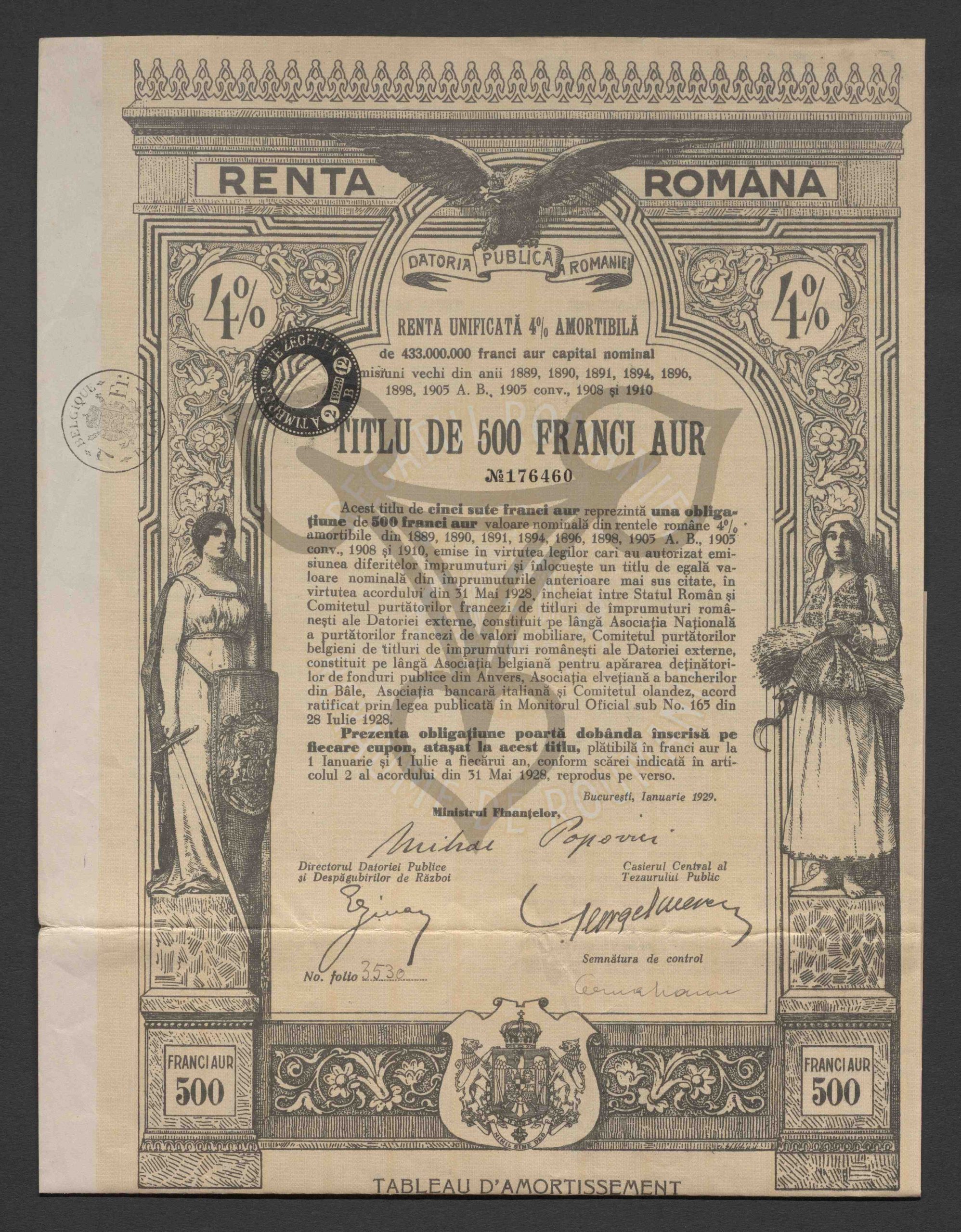Originaltitel: Renta unificată 4 % amortibilă de 433.000.000 franci aur capital nominal, Titlu de 500 franci aur No. 176460