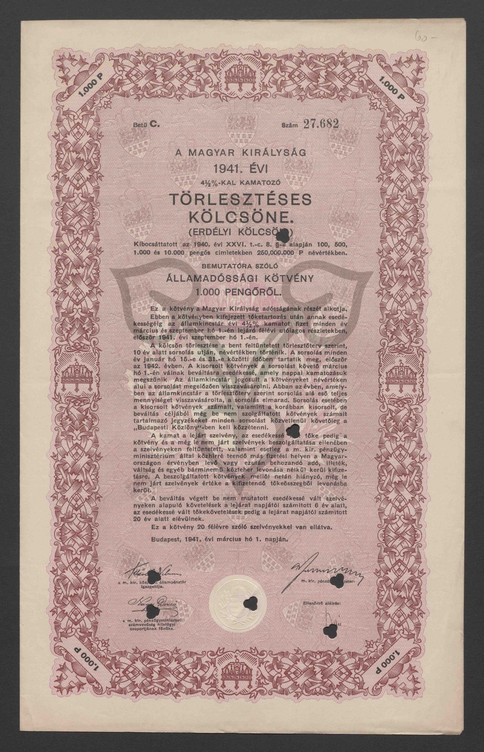 Originaltitel: 1941. évi 4 1/2 %-kal kamatozó Törlesztéses Kölcsöne. (Erdély Kölcsön). Bemutatóra szóló Államadóssági Kötvény 1.000 Pengőről, Betű C, Szám 27.682