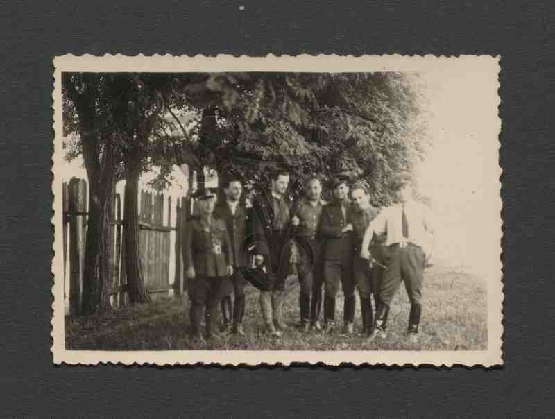 Eine Gruppe rumänischer Soldaten stehen im Freien auf einer Grünfläche nebeneinander und Blicken in die Kamera. Im Hintergrund Bäume, ein Bretterzaun und Gebäude.