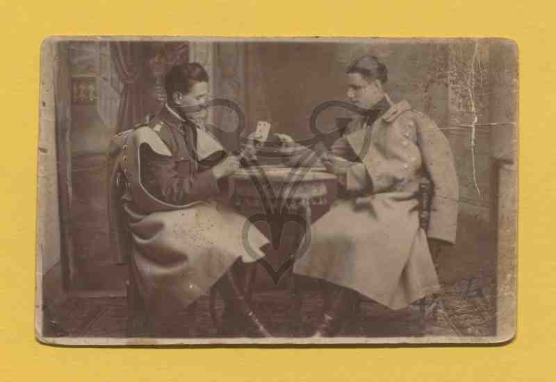 Atelieraufnahme. Gemalter Hintergrund, Tisch und Stühle Requisiten. Die beiden uniformierten Männer sitzen an einem kleinen achteckigen Tisch zueinander gewandt und spielen Karten. Beide tragen über der Uniform lange Mäntel, sind barhäuptig, halten in der jeweils linken Hand Spielkarten und blicken auf weiter auf dem Tisch liegende Karten. In der rechten unteren Ecke ist der Name des Fotoateliers eingeprägt.