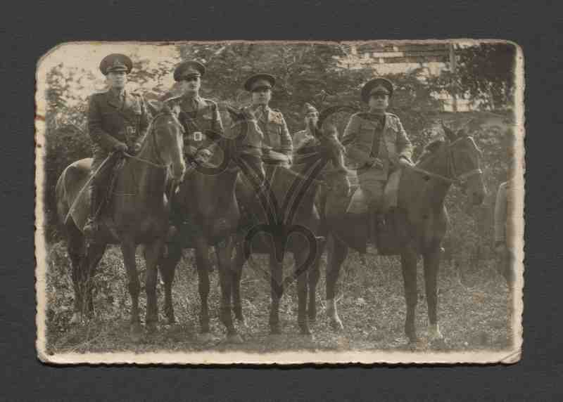 Auf einer Grünfläche fünf berittene Soldaten, vier davon tragen Schildmützen, der fünfte im Hintergrund Schiffchen. Hinter den Soldaten ein mit Gestrüpp bewachsener Hang, dahinter Gebäude. Am rechten Bildrand angeschnitten ein weiterer Soldat zu Fuß.