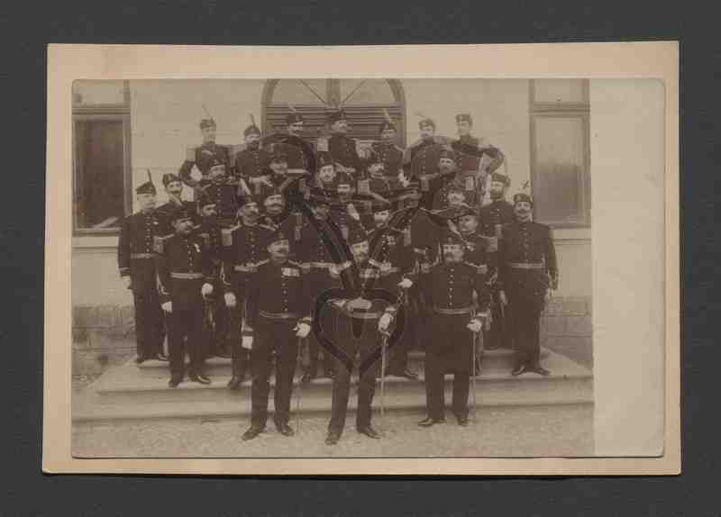 Die Soldaten sind auf dem Treppenaufstieg eines Gebäudes in mehreren Reihen aufgestellt. Alle tragen sie eine dunkle Uniform, Säbel, Handschuhe, Epauletten sowie Stoffmützen mit hohem Federschmuck.