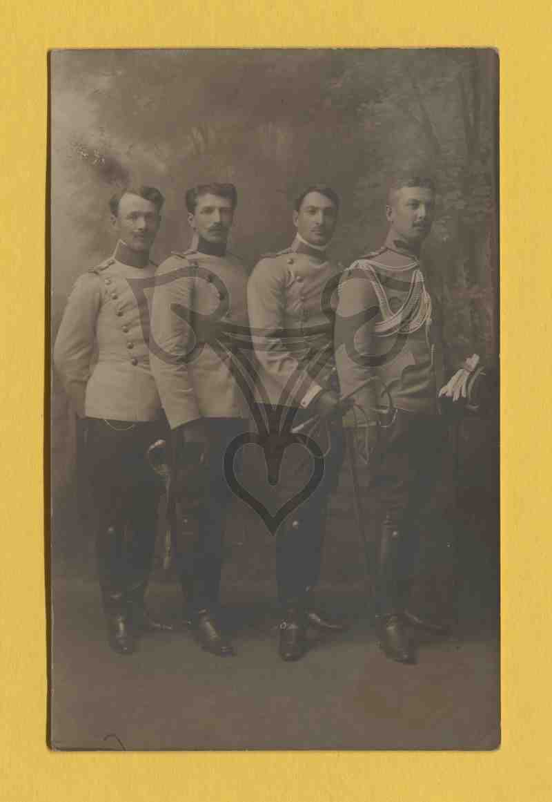 Studioaufnahme, gemalter Hintergrund. Vier Soldaten in rumänischer Uniform des Ersten Weltkriegs (Modell 1912) stehen in Riehe hintereinander. Alle sind nach rechts gewandt und blicken in die Kamera.