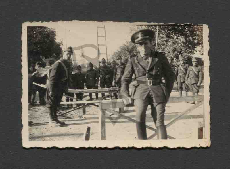 Der uniformierte Mann sitzt bildmittig rechts auf einem Laufhindernis und blickt in die Kamera. Im Hintergrund weitere Hindernisse sowie halbkreisförmig aufgestellte Soldaten. Dahinter bildmittig eine Leiter, links und rechts Bäume.