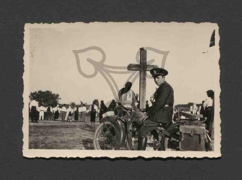 Der uniformierte Mann sitzt bildmittig rechts auf einem auf einem Motorrad. Hinter diesem ein großes Holzkreuz, dahinter Personen in rumänischer Tracht. In der oberen Bildhälfte wolkenloser Himmel.