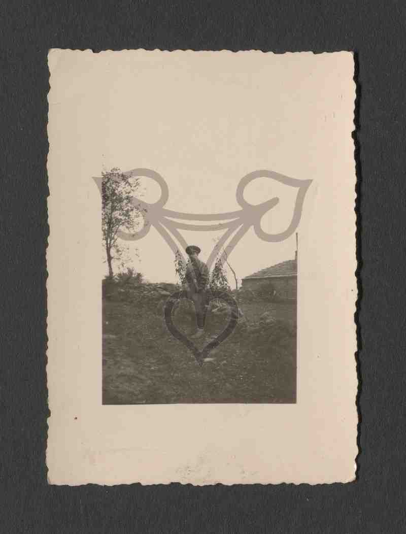 Der uniformierte Mann in Ledermantel und Schildmütze steht im Freien auf einem Schotterweg und blickt in die Kamera. Hinter ihm ein Kniehoher Steinzaun, am linken Bildrand ein Baum, im Hintergrund freie Fläche und ein Gebäude.