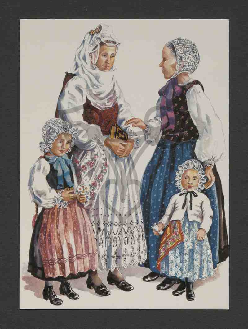 Vier Personen stehen aufrecht gruppiert. Links eine Frau mit einem Gesangbuch oder einer Bibel in der Hand, rechts daneben eine alte Frau, die der ersten die rechte Hand auf deren linken Unterarm legt. Davor zwei Mädchen unterschiedlichen Größe und Alters. Alle in unterschiedlichen Frauentrachten mit Haube und Schürze.