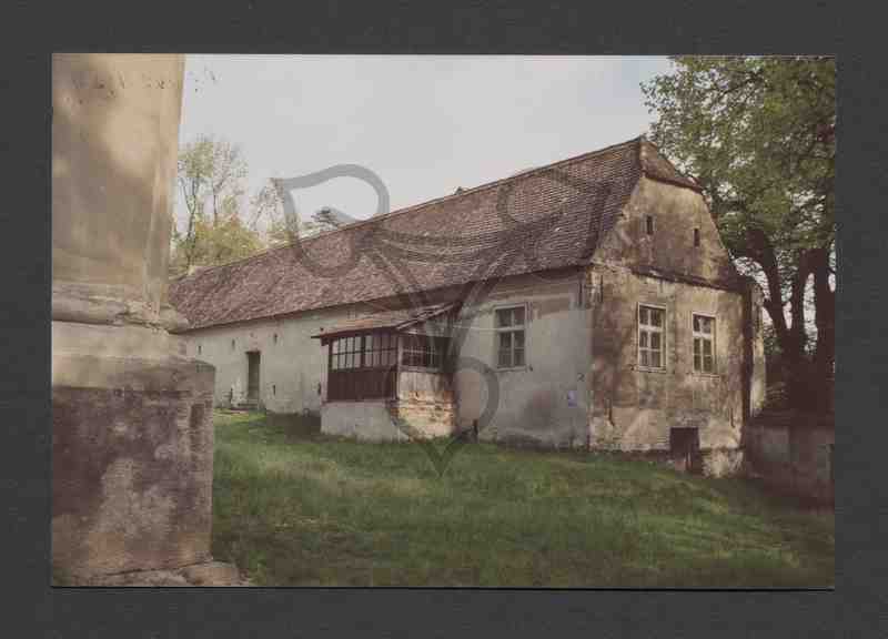 Langgezogenes Wohngebäude in die Wehrmauer integriert mit überdachtem und holzverkleidetem Treppenaufgang zum Haupteingang an der Längsseite. Da weiter hinten eine Nebeneingangstüre. An der Stirnseite zwei Fenster, mittig darunter eine Kellertüre. Am linken Bildrand eine Ecke des Kirchengebäudes.