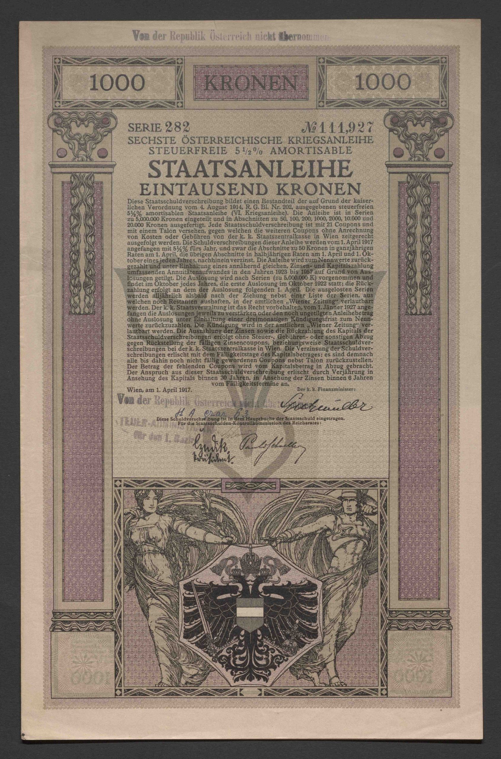 Sechste Österreichische Kriegsanleihe. Steuerfreie 5 1/2 % Amortisable Staatsanleihe. Eintausend Kronen, Serie 282, No. 111.927