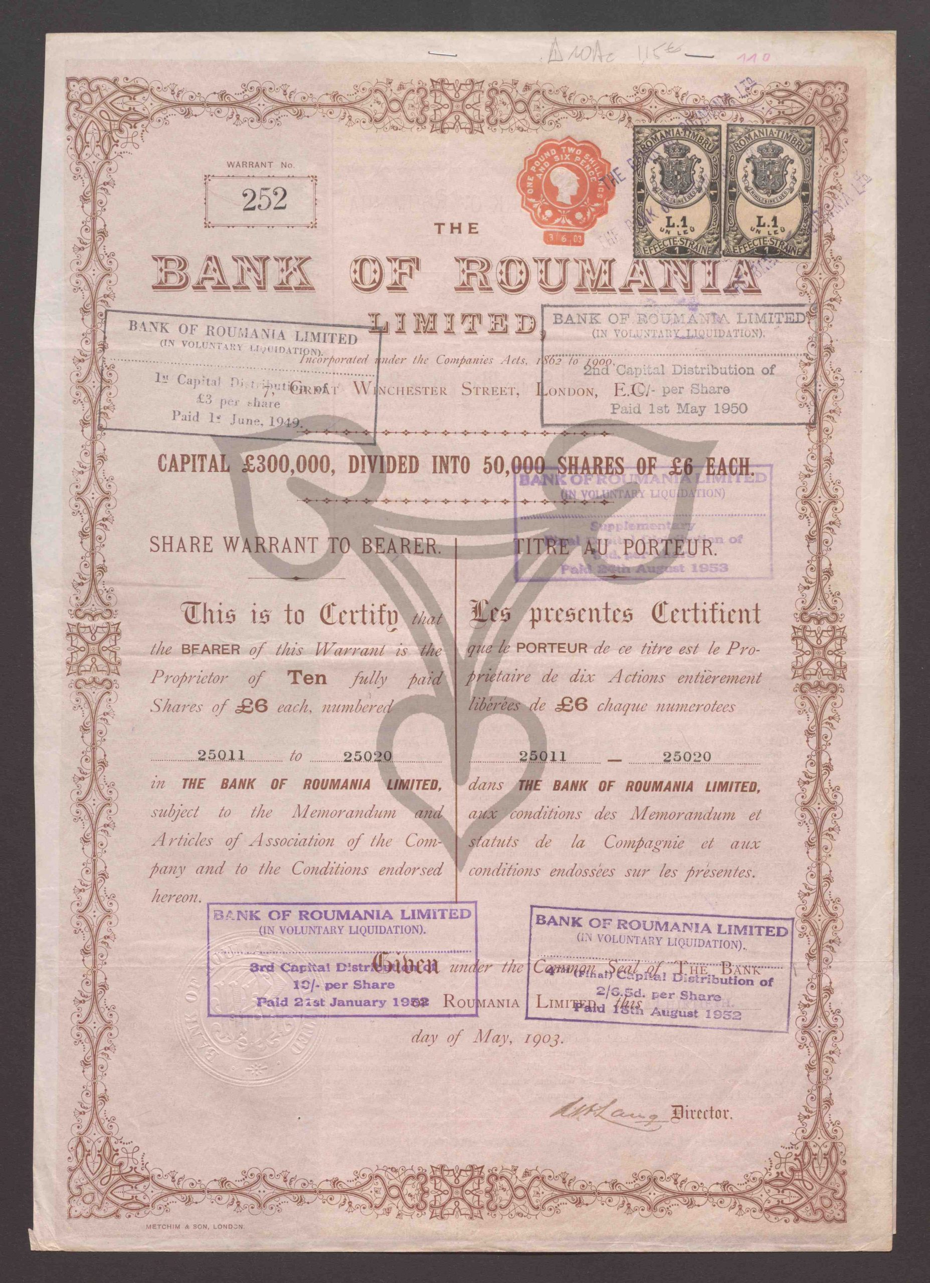 Share Warrant to Bearer. Capital Pound 300.00, Dividet Into 50.000 Shares of Pound 6 Each. One fully paid Share of Pounds 6. Warrant No. 252, Nr. 25011 to 25020