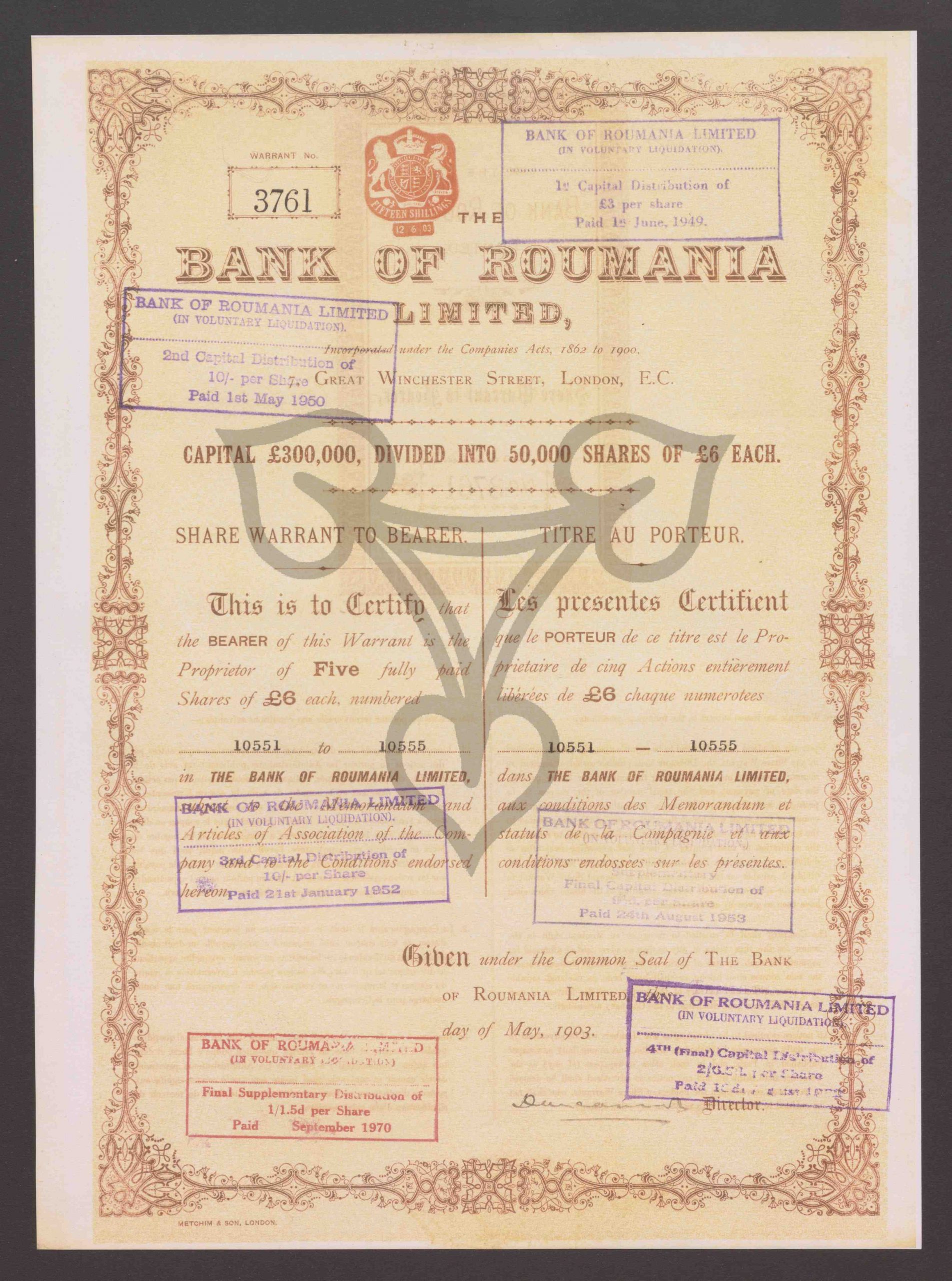 Share Warrant to Bearer. Capital Pound 300.00, Dividet Into 50.000 Shares of Pound 6 Each. One fully paid Share of Pounds 6. Warrant No. 3761, Nr. 10551 to 10555