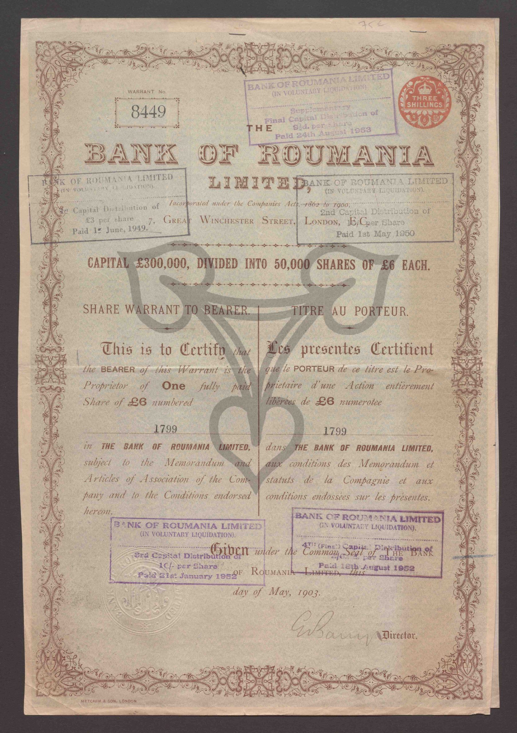 Share Warrant to Bearer. Capital Pound 300.00, Dividet Into 50.000 Shares of Pound 6 Each. One fully paid Share of Pounds 6. Warrant No. 8449, Nr. 1799
