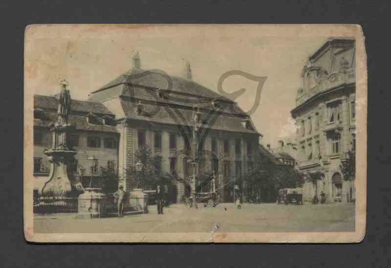 Bildmittig das Brukenthal-Palais, rechts davon die Statue des Hl. Nepomuk mit dem Amtssitz Brukenthals dahinter, rechts davon das Rathaus. Auf dem Platz sind mehrere Automobile und Personen verteilt.