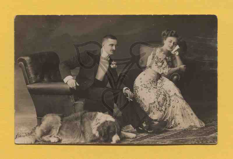 Studioaufnahme, neutraler Hintergrund, Sessel Requisit. Beide Personen sitzen in großen Ledersesseln, er links, sie rechts. Er trägt eine schwarzen Anzug, sie ein buntes Kleid. Beide sind sie nach vorne gebeugt, er hat seine rechte Hand auf der Lehne, in seiner auf dem Knie abgelegten linken hält er eine Zigarette und blickt die Frau an. Sie stützt den Kopf mit der linken Hand, der Oberarm liegt auf der Lehne, der rechte Unterarm ebenfalls, und blickt in die Kamera. Am unteren Bildrand mittig links liegt ein Hund. In der linken unteren Ecke ist das Werbelogo des Fotografen aufgedruckt.