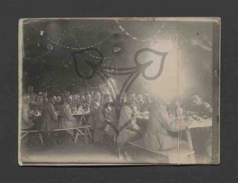 An rechtwinklig zueinander aufgestellten Bierzeltgarnituren sitzen Soldaten in rumänischer Uniform des Ersten Weltkriegs (Modell 1912) an gedeckten Tischen und blicken in die Kamera. Von der Decke hängen Girlanden.