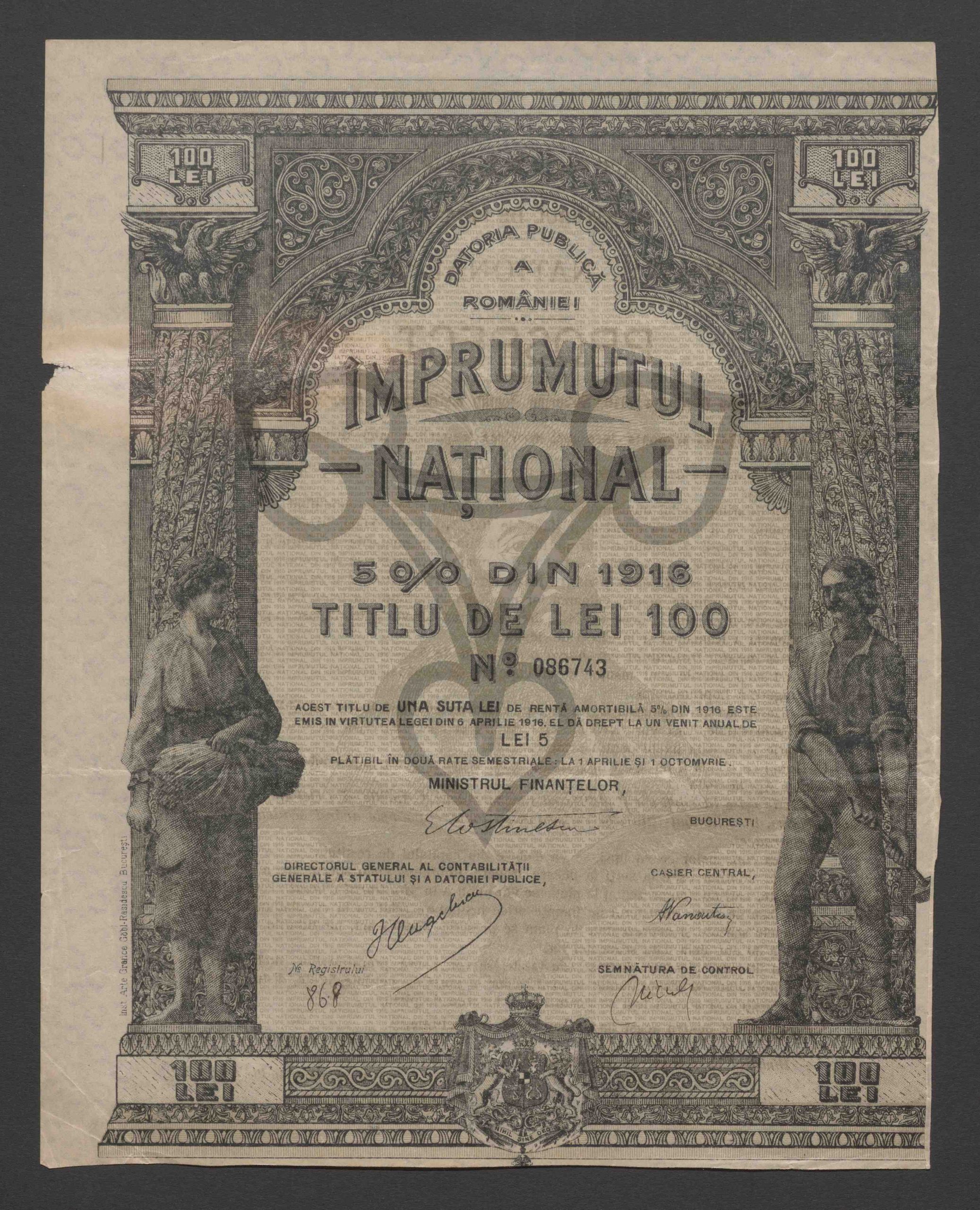 Originaltitel: Împrumutul National 5 % din 1916, Titlu de Lei 100 No. 086743